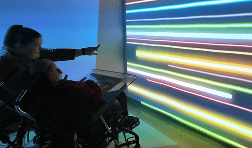 The immersive room at Green Fold provided the perfect setting to explore the visual and audio-rich experiences in Sensory Space. One standout moment came from Caitlin McNiven, a teacher in the PMLD department, who used the Spaceship activity to create a truly magical experience for one of her students. Oliver, a pupil with PMLD, was visibly captivated. Caitlin enhanced the activity by gently moving his chair in time with the spaceship’s motion on screen. This simple yet powerful adaptation gave Oliver the sensation of soaring through space. His whole body responded with joy - smiling, moving, and vocalising his excitement. When the animation paused, he signed “more,” clearly eager to continue. His engagement highlighted Sensory Space's ability to support communication, anticipation, and physical interaction in a way that was just right for him.